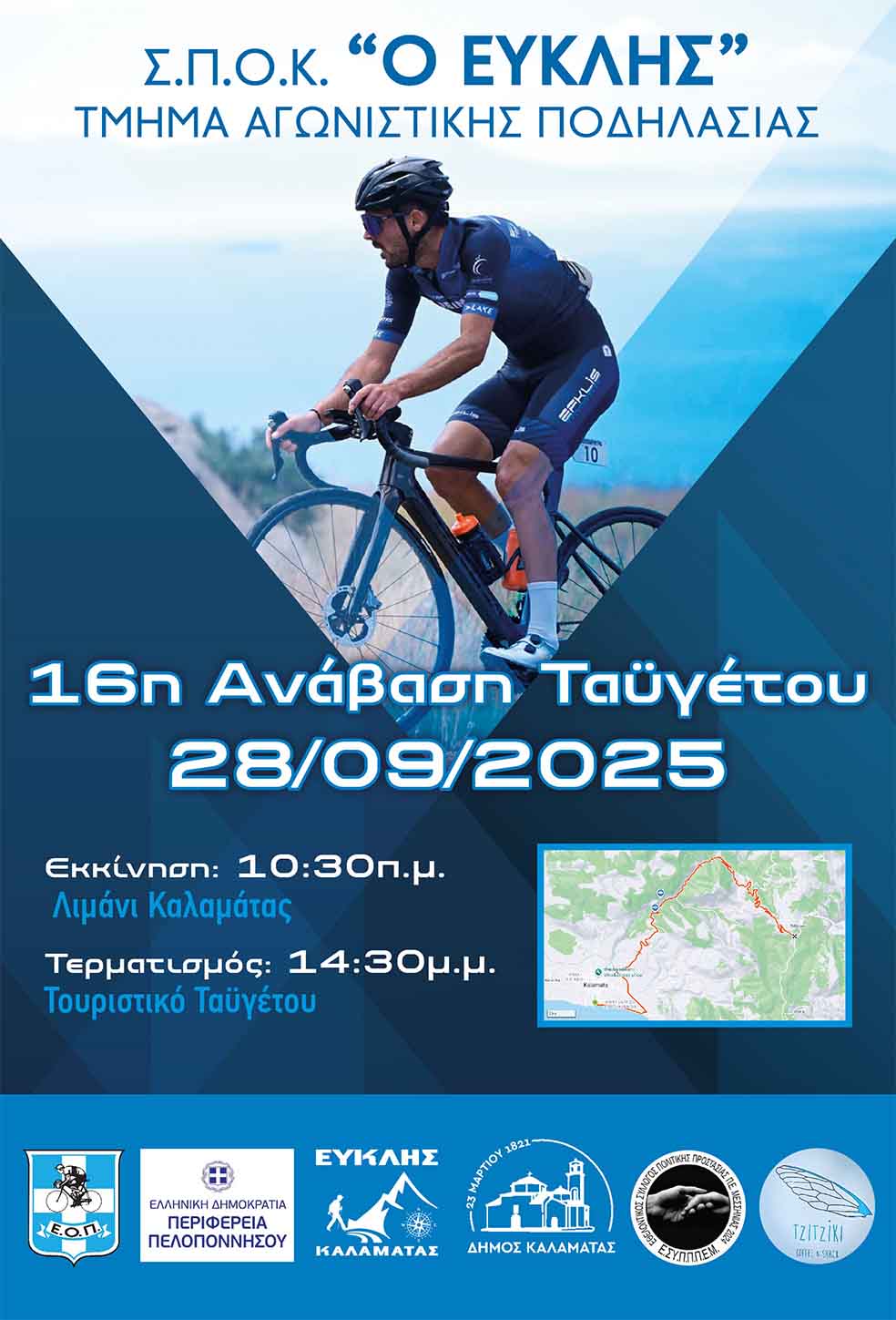 Στην τελική ευθεία έχει μπει ο ”Ευκλής” για την ολοκλήρωση των διαδικασιών του ποδηλατικού αγώνα αντοχής ”16η Ανάβαση Ταϋγέτου 2025”, που διοργανώνει αυτή την Κυριακή 28 Σεπτεμβρίου και μας προσκαλεί, να παρακολουθήσουμε ένα εξαιρετικό θέαμα με δυνατές ποδηλατικές στιγμές.