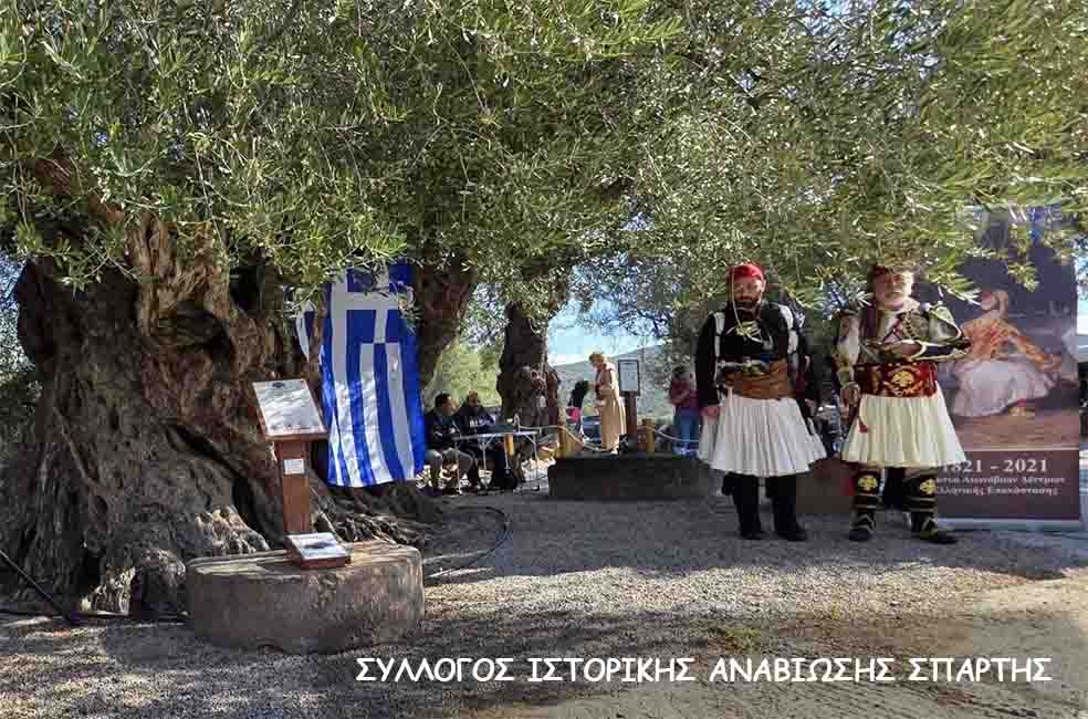 Εν συνεχεία, ακολούθησε η απαγγελία του Εθνικού Ύμνου από τους παρευρισκόμενους και μέσα σε ένα συγκινητικό κλίμα έγιναν τα αποκαλυπτήρια του σήματος του Δικτύου Αιωνόβιων Δέντρων Ελληνικής Επανάστασης από τον Υφυπουργό Εθνικής Άμυνας κ. Δαβάκη, τον Δήμαρχο Ευρώτα κ. Βέρδο , τον δημιουργό του Ινστιτούτου Πολιτισμού Μεσσηνίας κ. Κορδό και τον ιστορικό ερευνητή κ. Λαλούση. Εν συνέχεια, σε μια ιδιαίτερα συμβολική κίνηση, ο Δήμαρχος Ευρώτα παρέδωσε την Ελληνική Σημαία που σκέπαζε το σήμα του Δικτύου στο Πύραρχο και Διοικητή Πυροσβεστικής Λακωνίας κ. Χρήστο Νικολέτο για όσα προσφέρει η εν λόγω υπηρεσία για την προστασία της βιοποικιλότητας. Τέλος, για πρώτη φορά, αναβιώνοντας μια τελετουργία των Αρχαίων Ελλήνων, έγινε ταινίωση (περίδεση) της Γηραιότερης Ελιάς της Πελοποννήσου από μαθητές του 1ου ΕΠΑΛ Μολάων με κορδέλες λευκού και γαλάζιου χρώματος, δείχνοντας έτσι τον σεβασμό και την προστασία προς την ιερότητα του δέντρου. Η εκδήλωση ολοκληρώθηκε με την ευγενική προσφορά στους παρευρισκόμενους επετειακών συσκευασιών ελαιολάδου της Γηραιότερης Ελιάς της Πελοποννήσου που είχε επιμεληθεί ο ερευνητής κ. Λαλούσης, ενώ ο Δήμος Ευρώτα στο πλαίσιο της φιλοξενίας προσέφερε χυμούς, γλυκίσματα και τοπικά εδέσματα.
