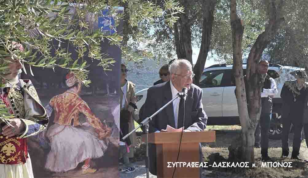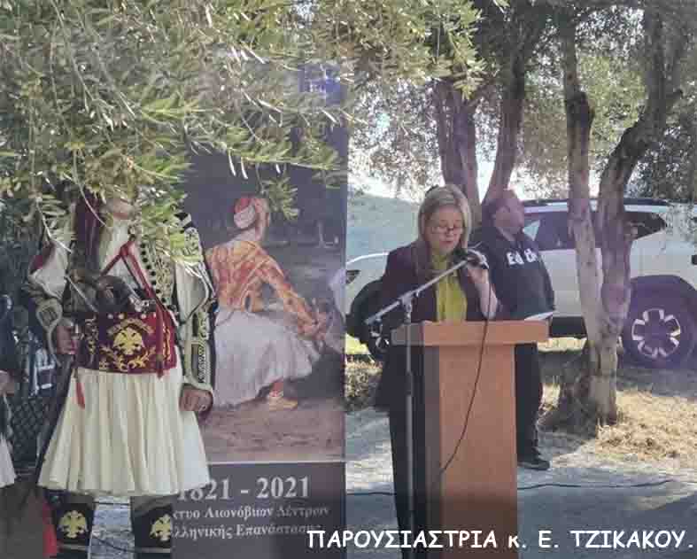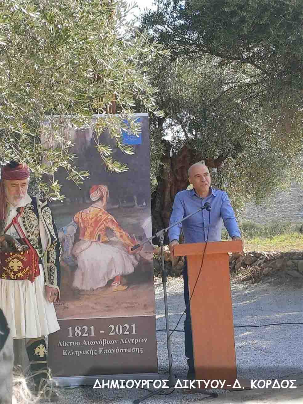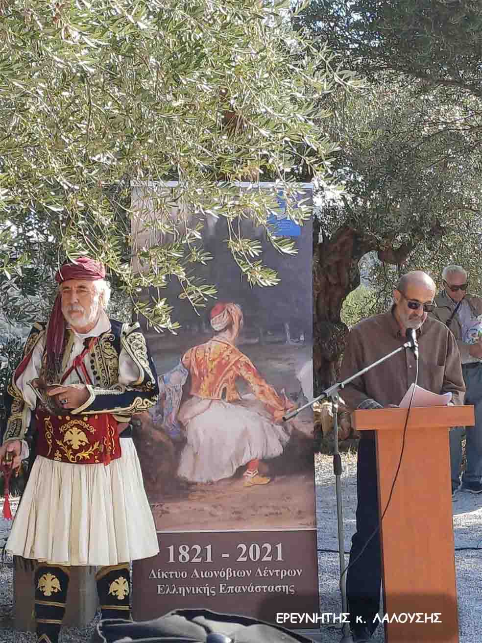 Ακολούθως, ο ερευνητής κ. Παναγιώτης Λαλούσης αναφέρθηκε εκτενώς στην ιστορική συσχέτιση της μνημειακής ελιάς με την Ελληνική Επανάσταση. Μεταξύ άλλων, τόνισε ότι η μνημειακή ελιά κατά το έτος 1821 «αφουγκράζεται» τον γοερό θρήνο της πρεσβυτέρας όταν οι Τούρκοι αποκεφάλισαν τον ιερέα του οικισμού ανήμερα του Αγ. Γεωργίου, ενώ 4 χρόνια αργότερα οι ορδές του Ιμπραήμ Πασά στην Λακωνία προκαλούν μεγάλες καταστροφές και η μνημειακή ελιά «είδε» τους Τουρκοαιγύπτιους να καίνε τα δέντρα της περιοχής, να λεηλατούν τον οικισμό της Απιδέας και να αιχμαλωτίζουν τον άμαχο πληθυσμό του και να τον οδηγούν στα κάστρα της Μεθώνης και του Νεόκαστρου στην Μεσσηνία. Επιπλέον, επισήμανε ότι αναφορά του Θεόδωρου Κολοκοτρώνη προς το Υπουργείο Πολέμου τον Σεπτέμβριο του 1825 αναφέρει χαρακτηριστικά: «Έκαυσεν όλα τα πέριξ χωρία εν μόνον είχεν άκαυστον Μολάους λεγόμενον και το έκαυσεν και εκείνο χθες. Δεν παύει όμως να καπνίζει την ατμόσφαιραν και αφού δεν έχει πλέον χωρία να καίει, καίει τους φράκτες των αμπελιών», ενώ ίδια εικόνα αποτυπώνεται και σε έγγραφο του Παναγιώτη Γιατράκου προς τον Κουντουριώτη το οποίο αναφέρει «ο Iμπραήμ αφού έκαψε τους Μολάους, αντιλαμβανόμενος τις προθέσεις του αντιπάλου κινήθηκε προς τα Νιάτα και την Απιδιά, θέτοντας ως στόχο τώρα τα Κουνουποχώρια». Τόνισε ακόμη ότι η εν λόγω υπεραιωνόβια ελιά αλλά και όσες γηραιές βρίσκονται μέχρι σήμερα στους παρακείμενους αγρούς αποτελούσαν κατά την περίοδο της Ελληνικής Επανάστασης σημαντική πηγή εισοδήματος εθνικού λαδιού, ενώ σχετική αναφορά γίνεται σε επιστολή του πολιτάρχη της Μονεμβασίας Ευαγγέλη Νικότζη προς την Υπέρτατη Διοίκηση τον Μάρτιο του 1824 στην οποία σημειώνεται ότι «ο Χ΄Στεφανής ετραβήχθη έως το ακρινόν χωρίον της επαρχίας, ονομαζόμενον Απιδιά..εστάθη δύο τρεις ημέρας και εσύναζε τα εθνικά λάδια της». Ανέφερε ακόμη ότι η μνημειακή ελιά της Απιδέας «αγνάντεψε» τους προγόνους μας να υψώνουν την ελληνική σημαία στον λόφο του «Πύργου» και της «Κριτσόβας» και «άκουσε» την καμπάνα του ναού της Κοιμήσεως της Θεοτόκου να αναγγέλλει το χαρμόσυνο μήνυμα της ελευθερίας, ενώ λόγω του μεγέθους της θα πρόσφερε την σκιά της σε Έλληνες αρματωμένους και σε βοσκούς που απάγκιασαν με τα κοπάδια της στον κορμό της.