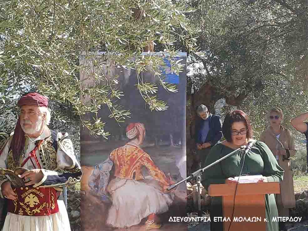 Στο πλαίσιο των σύντομων χαιρετισμών, ο αρχιερατικός επίτροπος Μολάων πρωτ. Παναγιώτης Λεγάκης μετέφερε τις ευχές και τις ευλογίες του Μητροπολίτη Μονεμβασίας και Σπάρτης Ευστάθιου, ο Υφυπουργός Εθνικής Άμυνας κ. Αθανάσιος Δαβάκης μοιράστηκε με τους παρευρισκόμενους ένα αγαπημένο του ποίημα για τον συμβολισμό της ελιάς, ο Δήμαρχος Ευρώτα κ. Δήμος Βέρδος τόνισε την σημασία προστασίας και ανάδειξης του υπεραιωνόβιου δέντρου, ο Περιφερειακός Σύμβουλος κ. Παναγιώτης Τζινάκος εκπροσωπώντας την Περιφέρεια Πελοποννήσου αναφέρθηκε στην στήριξη της Περιφέρειας σε θέματα πολιτισμού και περιβάλλοντος, ο δημιουργός του εν λόγω ερευνητικού Δικτύου κ. Δημοσθένης Κορδός εστίασε στην εξέλιξη και στους στόχους του προγράμματος τονίζοντας την σημασία του έργου για την προστασία και την ανάδειξη των μνημειακών δέντρων της Πελοποννήσου, ο δάσκαλος και συγγραφέας κ. Γεώργιος Μπόνος αναφέρθηκε στην έρευνα του για τα αιωνόβια ελαιόδεντρα της Λακωνίας, ενώ τόνισε ότι το λάδι της ελιάς θεωρείται η πρώτη κυρίαρχη γεύση μετά το μητρικό γάλα αποτελώντας τον δεύτερο ομφάλιο λώρο της ζωής μας και η Διευθύντρια κ. Ευγενία Μπέρδου του 1ου ΕΠΑΛ Μολάων μίλησε για την πρωτοβουλία του σχολείου να αποτελέσει πρεσβευτής της μνημειακής ελιάς στο Πανελλήνιο Σχολικό Δίκτυο. Την εκδήλωση τίμησαν ακόμη με την παρουσία τους ο Διοικητής του Κέντρου Εκπαίδευσης Εφοδιασμού Μεταφορών (ΚΕΕΜ) Σπάρτης Ταξίαρχος κ. Γεώργιος Ζορμπάς, ο αντιδήμαρχος Δήμου Σπάρτης κ. Θεοφάνης Λάζαρης, ο Προϊστάμενος της Διεύθυνσης Δασών Λακωνίας κ. Ηλίας Κοντάκος, ο Διευθυντής του πολιτιστικού οργανισμού «Δρόμοι της Ελιάς» κ. Γεώργιος Καραμπάτος καθώς και μέλη του οργανισμού, ο υποδιοικητής του αστυνομικού τμήματος Ευρώτα κ. Γεώργιος Ευσταθίου, ο Πρόεδρος του Συνδέσμου Αποστράτων Σωμάτων Ασφαλείας Λακωνίας κ. Παναγιώτης Λιάσκος, εκπρόσωποι τοπικών συλλόγων, εκπαιδευτικοί της Πρωτοβάθμιας και Δευτεροβάθμιας Εκπαίδευσης Λακωνίας καθώς και πλήθος κόσμου. Αξίζει να σημειωθεί ότι στην τελετή παρέστεκαν τιμητικά και με σεβασμό τα μέλη του Συλλόγου Ιστορικής Αναβίωσης Σπάρτης με τοπικές παραδοσιακές φορεσιές της περιόδου της Ελληνικής Επανάστασης, φέροντας ανάλογη αρματωσιά για να τιμήσουν τους αγώνες των Ελλήνων για ελευθερία καθώς και την ιερή ελιά που αποτελεί τον γηραιότερο μάρτυρα της Ελληνικής Επανάστασης στην Πελοπόννησο.