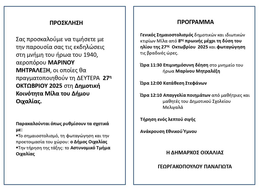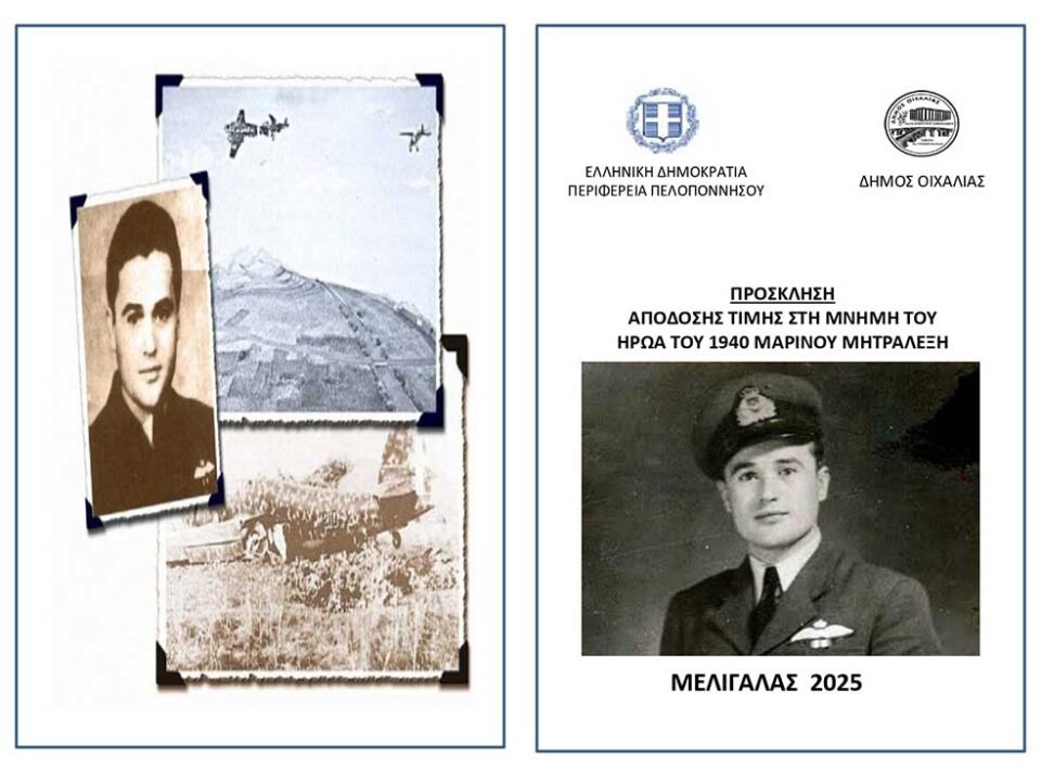 Με την καθιερωμένη επισημότητα θα τιμηθεί τη Δευτέρα 27 Οκτωβρίου 2025 στις 11:30 στο Μίλα του Δήμου Οιχαλίας, η μνήμη του ηρώα αεροπόρου του 1940 Μαρίνου Μητραλέξη.