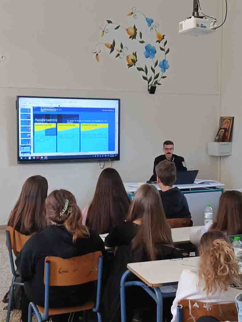 Με αφορμή την Παγκόσμια Ημέρα Ασφαλούς Πλοήγησης στο Διαδίκτυο (10/02/2026) πραγματοποιήθηκε ενημερωτική παρουσίαση στη Γ’ τάξη του Γυμνασίου Καρδαμύλης από τον Διοικητή του Αστυνομικού Τμήματος Δυτικής Μάνης, κο Χρονόπουλο Παναγιώτη.