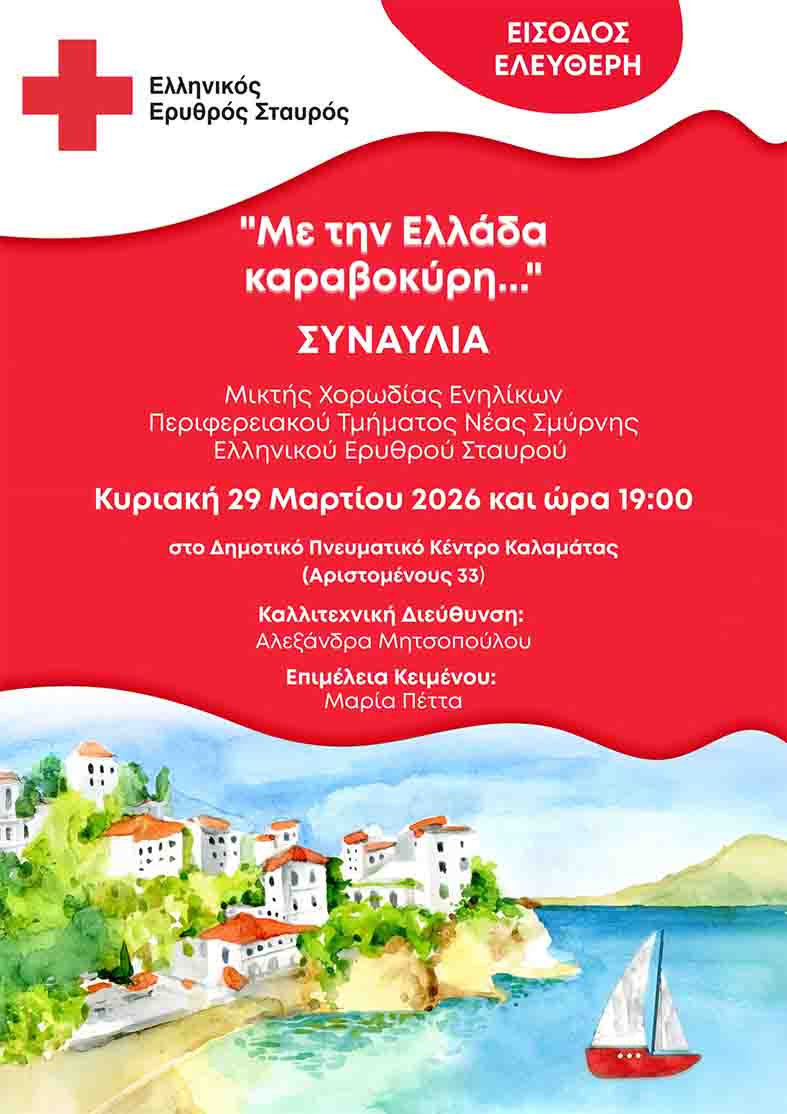 Ο Ελληνικός Ερυθρός Σταυρός (Ε.Ε.Σ) διοργανώνει, την Κυριακή 29 Μαρτίου 2026 και ώρα 19:00, στο Δημοτικό Πνευματικό Κέντρο Καλαμάτας (Αριστομένους 33), μεγάλη ανοικτή για το κοινό συναυλία της Μικτής Χορωδίας Ενηλίκων του Περιφερειακού Τμήματος Νέας Σμύρνης του Ελληνικού Ερυθρού Σταυρού, με τίτλο: “Με την Ελλάδα καραβοκύρη…”.