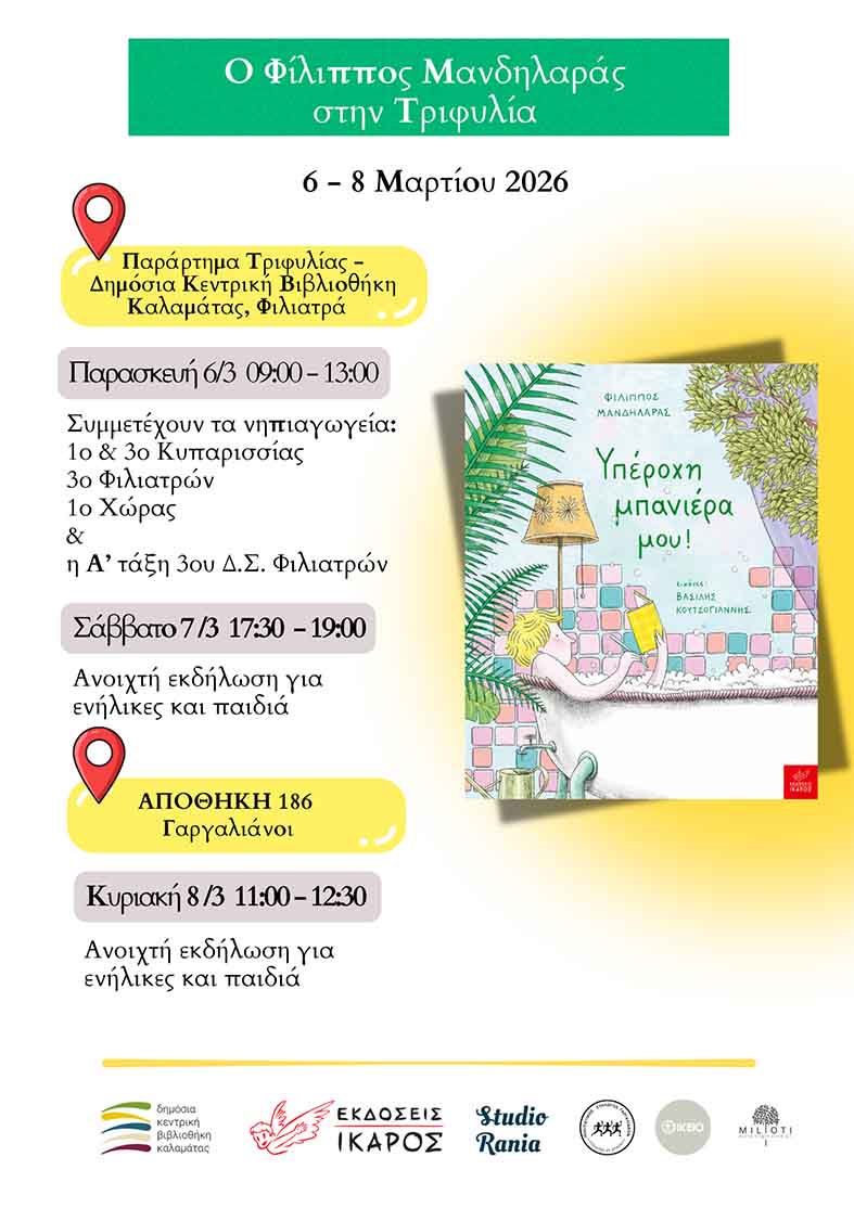 Η Δημόσια Κεντρική Βιβλιοθήκη Καλαμάτας, στο πλαίσιο των δράσεων ενίσχυσης της φιλαναγνωσίας και προώθησης της παιδικής λογοτεχνίας διοργανώνει τριήμερη εκδήλωση στην Τριφυλία. Συγκεκριμένα ο συγγραφέας Φίλιππος Μανδηλαράς θα επισκεφθεί την Τριφυλία με αφορμή την κυκλοφορία του νέου του βιβλίου «Υπέροχη μπανιέρα μου», σε εικονογράφηση του Βασίλη Κουτσογιάννη (Εκδόσεις Ίκαρος).