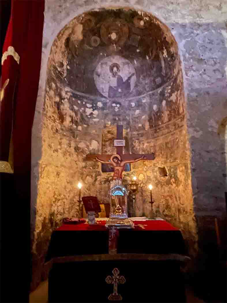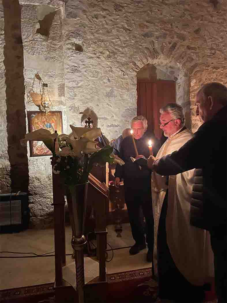 << Με κατάνυξη, μόνο με το φως των κεριών, παρακολουθήσαμε την Ακολουθία των Χαιρετισμών προς την Υπεραγία Θεοτόκο, στον μικρό, πετρόκτιστο Ναό, κτισμένο το 1740, με τις εξαιρετικές αγιογραφίες στο ιερό του.