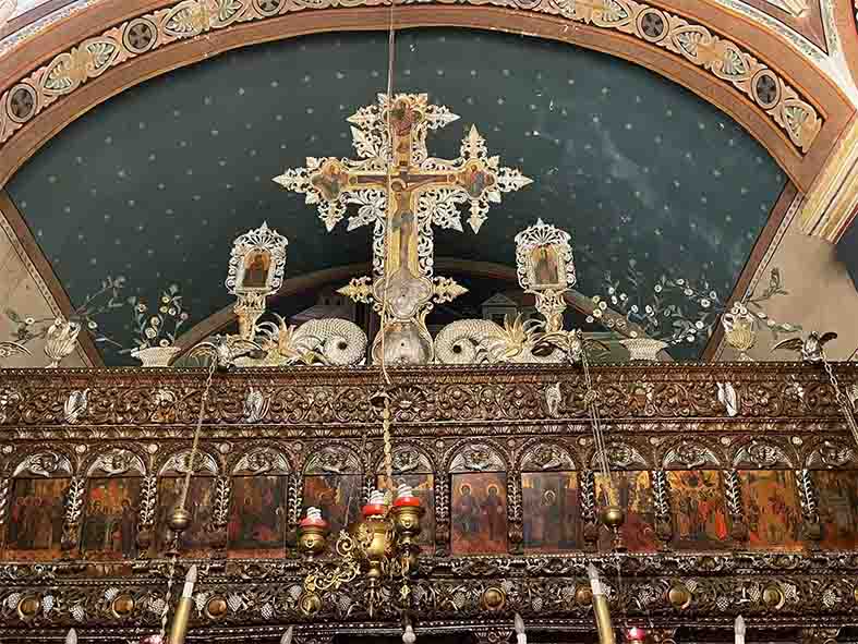 Ακριβώς πάνω από τον μικρό αυτόν Ναό, σε απόσταση λίγων μέτρων, ο άλλος Ναός της ενορίας, η Κοίμηση της Θεοτόκου, με το ξυλόγλυπτο, εξαιρετικό τέμπλο, κτισμένος το 1720.