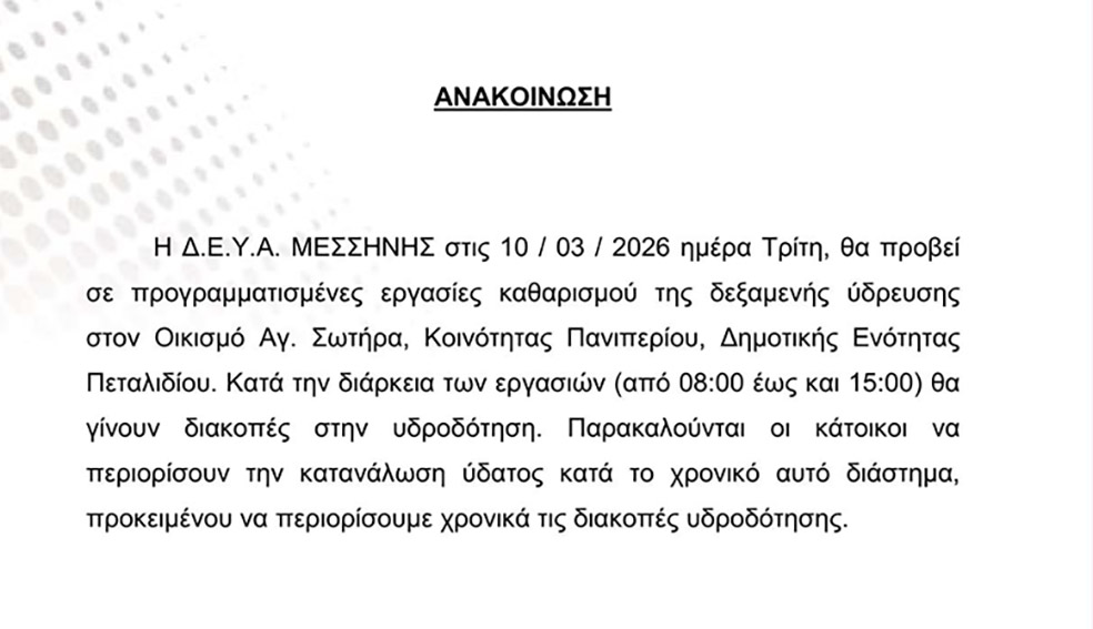 TOP NEWSΕΙΔΗΣΕΙΣΜΕΣΣΗΝΙΑΔ.Ε.Υ.Α. ΜΕΣΣΗΝΗΣ – Διακοπές υδροδότησης σε περιοχές του Δήμου την Τρίτη 10 Μαρτίου