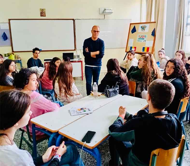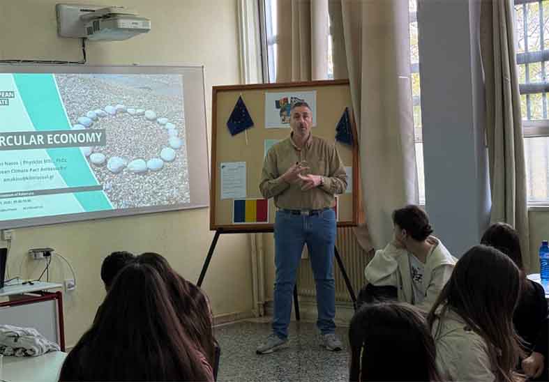 Στην παρουσίαση συμμετείχε, επίσης, ο Νάσος Μάκιος, Πρεσβευτής του Ευρωπαϊκού Συμφώνου για το Κλίμα και μέλος της ομάδας Mission του Δήμου Καλαμάτας, ο οποίος μίλησε στους μαθητές για την έννοια της κυκλικής οικονομίας και τον ρόλο της στη μετάβαση προς ένα βιώσιμο μοντέλο ανάπτυξης. Μέσα από πρακτικά παραδείγματα, εξήγησε πώς οι αρχές της επαναχρησιμοποίησης, της επισκευής, του διαμοιρασμού και της ορθολογικής διαχείρισης των πόρων μπορούν να συμβάλουν ουσιαστικά στην προστασία του περιβάλλοντος και στην ενίσχυση της βιώσιμης ανάπτυξης.