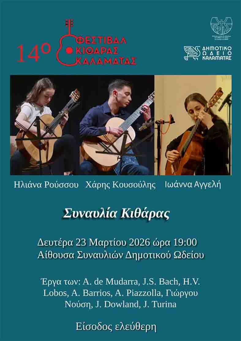Στο πλαίσιο των παράλληλων εκδηλώσεων του 14ου Φεστιβάλ Κιθάρας Καλαμάτας θα έχουμε την χαρά να απολαύσουμε τρία αγαπημένα παιδιά του Φεστιβάλ και του Δημοτικού Ωδείου Καλαμάτας. Την Ιωάννα Αγγελή, την Ηλιάνα Ρούσσου και τον Χάρη Κουσούλη. Οι τρεις νέοι μουσικοί θα ερμηνεύσουν κάποια από τα έργα που προετοιμάζουν για τις πτυχιακές ή διπλωματικές τους εξετάσεις.