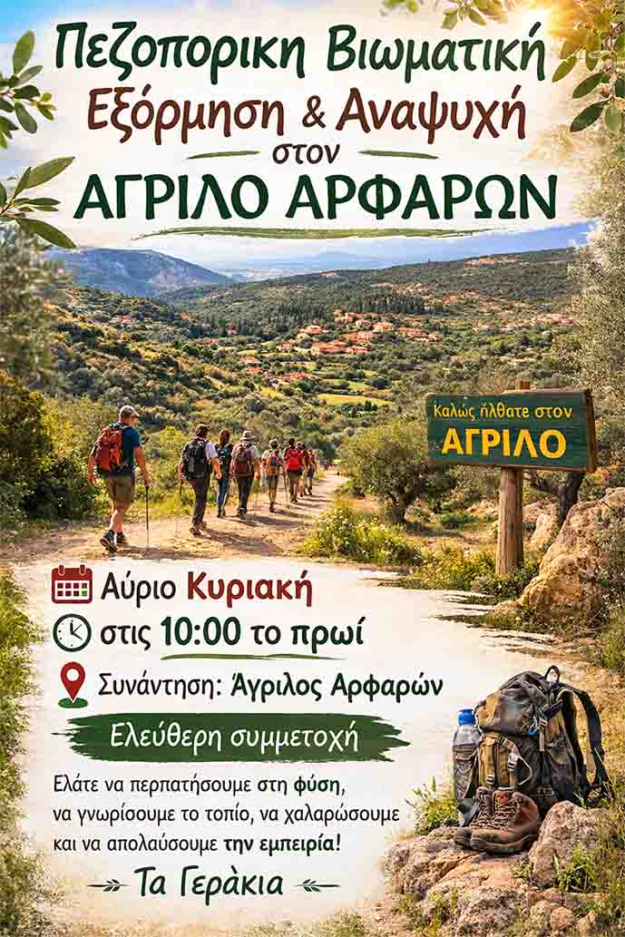 Σημείο συνάντησης: Άγριλος Αρφαρών🕙 Ώρα: 10:00 π.μ.🎒 Ελεύθερη συμμετοχή