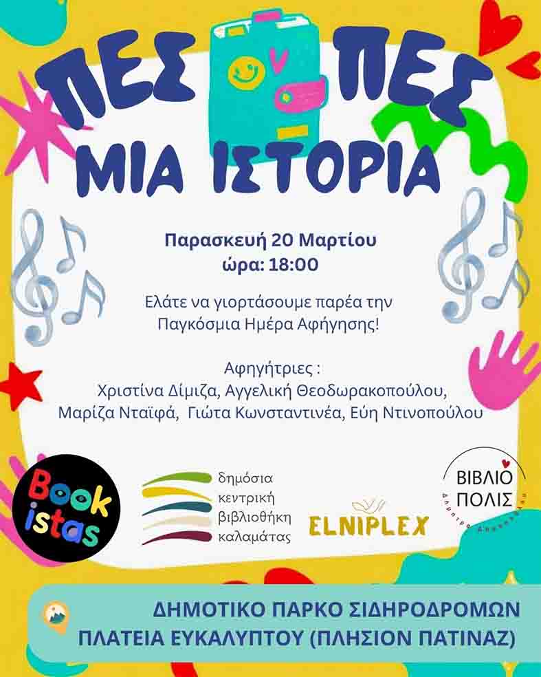 Η Δημόσια Κεντρική Βιβλιοθήκη Καλαμάτας, οι Bookistas, το Elniplex και το βιβλιοπωλείο ΒΙΒΛΙΟΠΟΛΙΣ γιορτάζουν την Παγκόσμια Ημέρα Αφήγησης και προσκαλούν μικρούς και μεγάλους σε ένα απόγευμα αφιερωμένο στην αφήγηση.