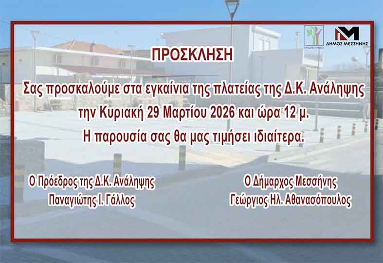 ΔΗΜΟΣ ΜΕΣΣΗΝΗΣ : Εγκαινιάζεται στις 29 Μαρτίου η νέα πλατεία στην Δημοτική Κοινότητα Ανάληψης