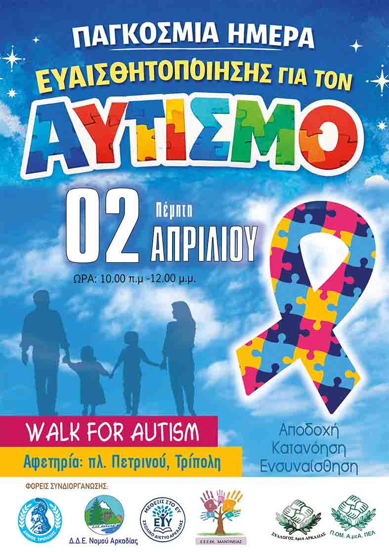 Στην Τρίπολη θα πραγματοποιηθεί η συμβολική πορεία  “Walk for Autism” με αφορμή την παγκόσμια ημέρα ευαισθητοποίησης για τον αυτισμό. Στόχος της εκδήλωσης η ενημέρωση και ευαισθητοποίησης των ατόμων με αυτισμό .