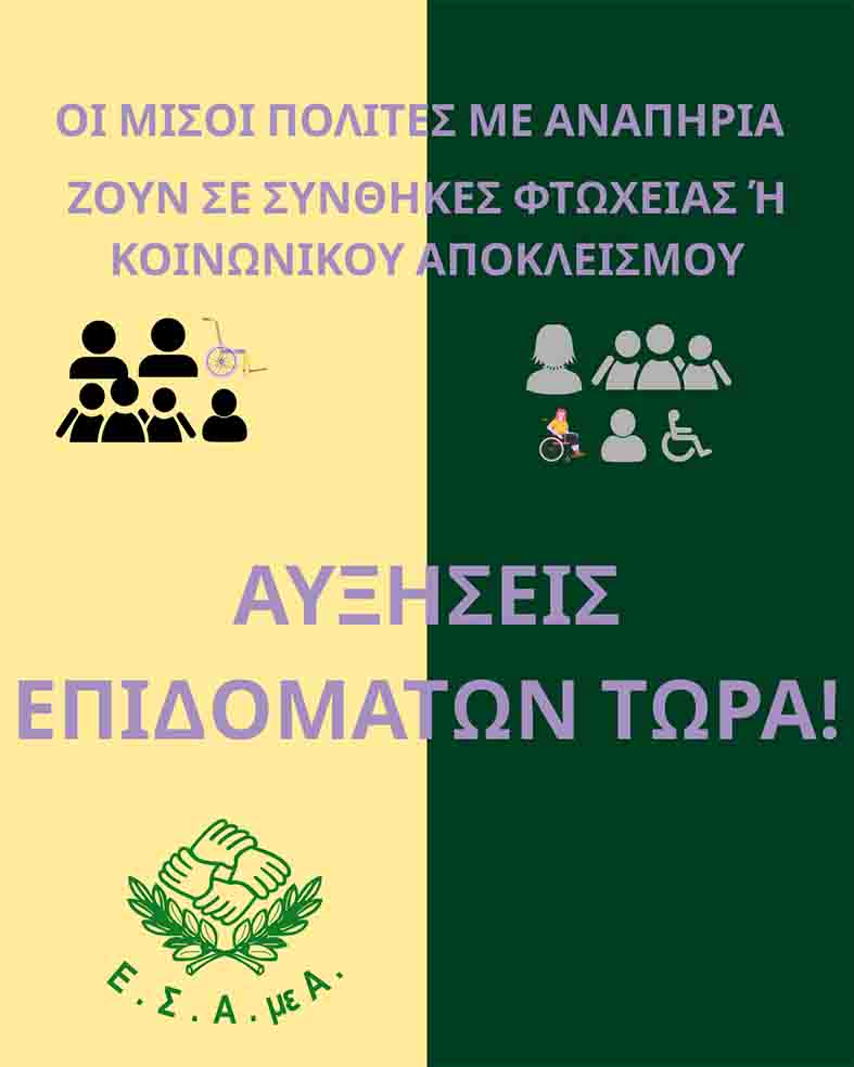 Τα αναπηρικά επιδόματα εξακολουθούν να παραμένουν σε εξαιρετικά χαμηλά επίπεδα, δυσανάλογα σε σχέση με την αλματώδη αύξηση του κόστους ζωής σε βασικά αγαθά, και υπηρεσίες, όπως στα τρόφιμα, στην ενέργεια, στα καύσιμα, στην υγεία, στη στέγαση και δεν επαρκούν για την κάλυψη των πραγματικών αναγκών διαβίωσης, ούτε των πρόσθετων δαπανών που συνεπάγεται η αναπηρία, οδηγώντας χιλιάδες άτομα με αναπηρία και τις οικογένειές τους σε συνθήκες οικονομικής ασφυξίας, κοινωνικού αποκλεισμού και διαρκούς ανασφάλειας.
