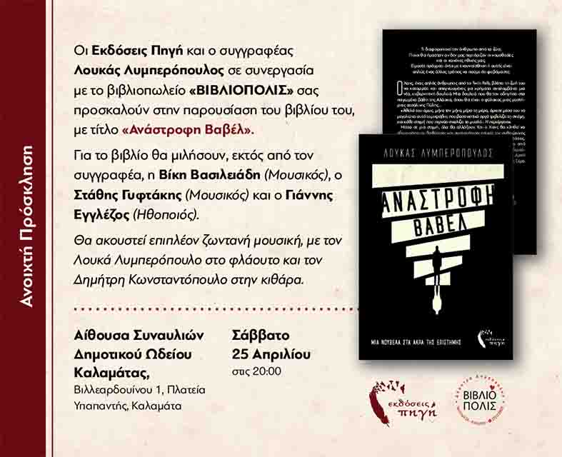 Οι Εκδόσεις Πηγή και ο συγγραφέας Λουκάς Λυμπερόπουλος σε συνεργασία με το βιβλιοπωλείο «ΒΙΒΛΙΟΠΟΛΙΣ» σας προσκαλούν στην παρουσίαση του βιβλίου του, με τίτλο «ΑΝΑΣΤΡΟΦΗ ΒΑΒΕΛ» το Σάββατο 25 Απριλίου στις 8:00 μ.μ. στην Αίθουσα Συναυλιών του Δημοτικού Ωδείου Καλαμάτας (Βιλλεαρδουίνου 1, Πλατεία Υπαπαντής Καλαμάτας).