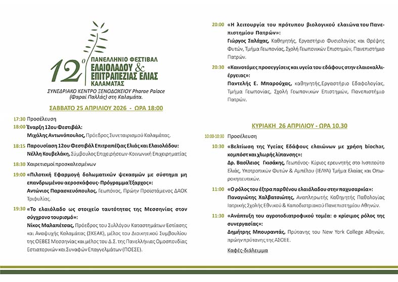 Το Πανελλήνιο Φεστιβάλ Ελαιόλαδου & Ελιάς, επιστρέφει δυναμικά στην Καλαμάτα ενώ έχει πλέον καθιερωθεί ως ένα από τα σημαντικότερα ετήσια forum για την ελαιοκομία στην Ελλάδα, αποτελώντας σημείο συνάντησης επιστημόνων, παραγωγών και επαγγελματιών του αγροδιατροφικού τομέα. Με επίκεντρο τη γνώση, την καινοτομία και τη βιώσιμη ανάπτυξη, το Φεστιβάλ συμβάλλει ουσιαστικά στη διαμόρφωση του μέλλοντος του αγροτικού κλάδου.